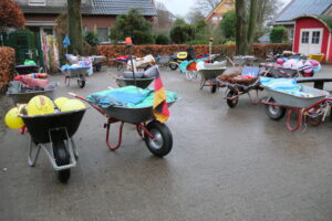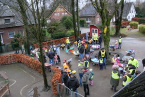 Die Tornisterbandenkinder kamen gemeinsam mit ihren Vätern und toll geschmückten Schubkarren zum Kindergarten. Und dann ging es los.